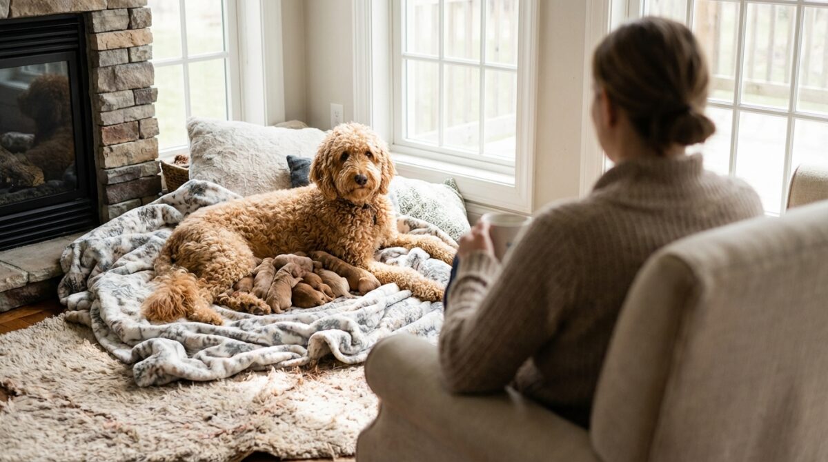 Die Geburt zog sich über rund 13 Stunden hin, was für eine Hündin dieser Größe eine enorme Anstrengung bedeutete. Während der gesamten Zeit blieben die Besitzer an Marigolds Seite, achteten auf die Abstände zwischen den Welpen und standen im Austausch mit dem Tierarzt. Für den Ernstfall war eine Tierklinik stets in Reichweite.